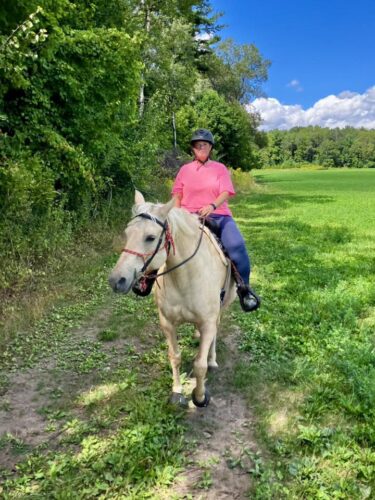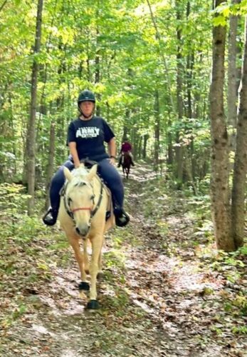 Maddie is very people-oriented and loves attention! She’s easy to catch, loads and trailers like a pro, and has excellent barn manners. She stands quietly for grooming, saddling, and mounting—and waits for your cue before moving off. She remembers her lessons well and learns new things quickly!